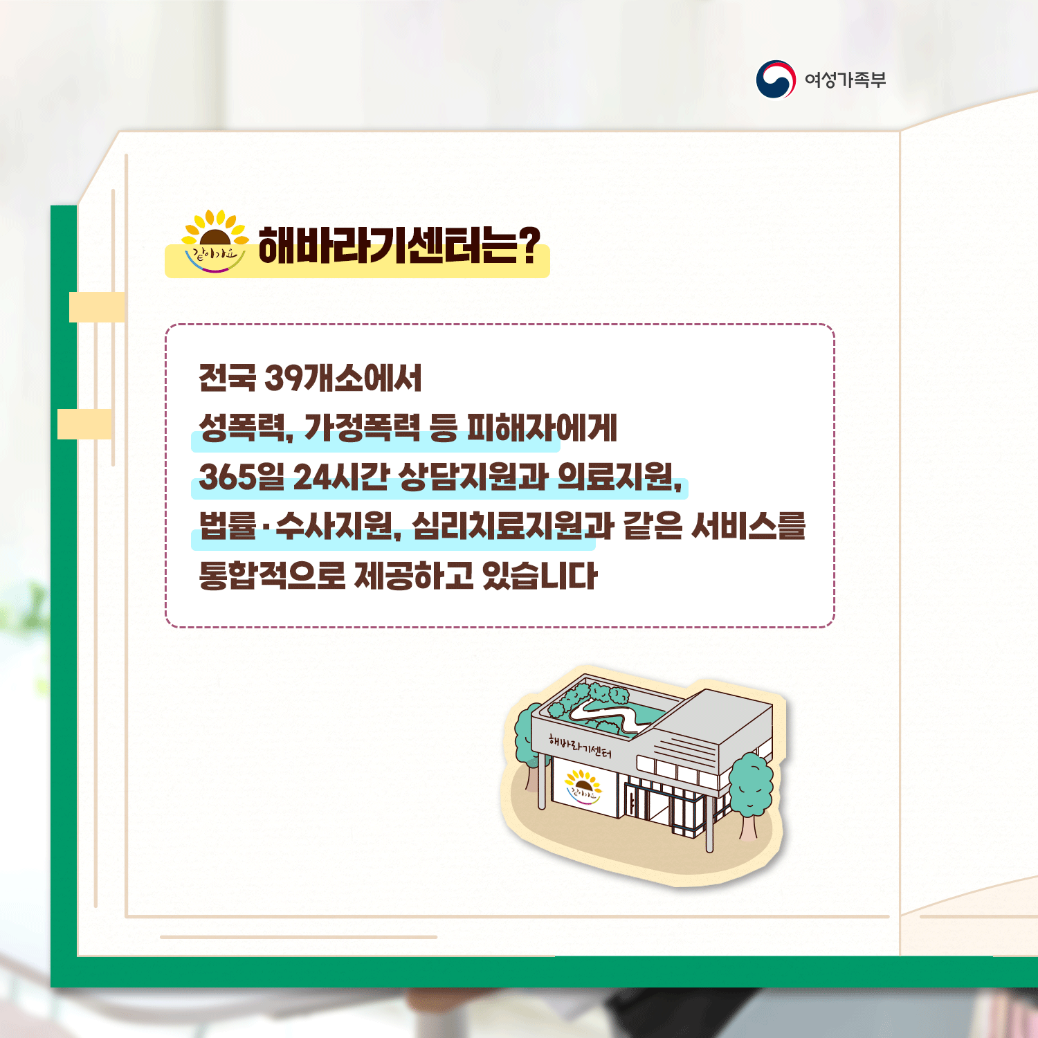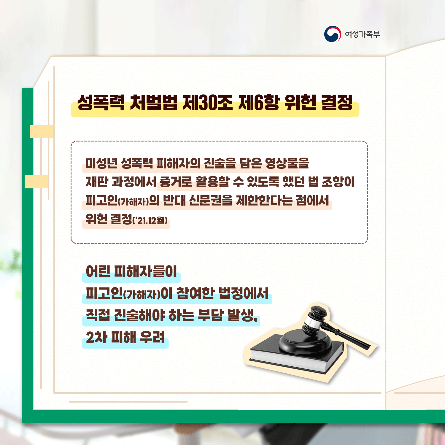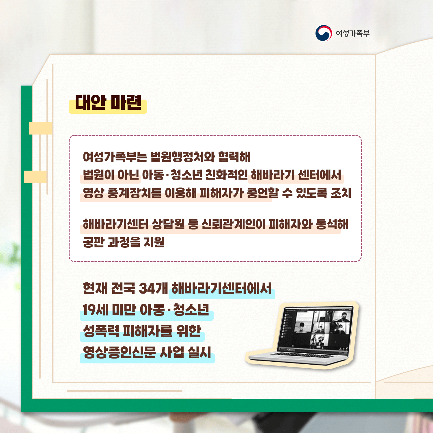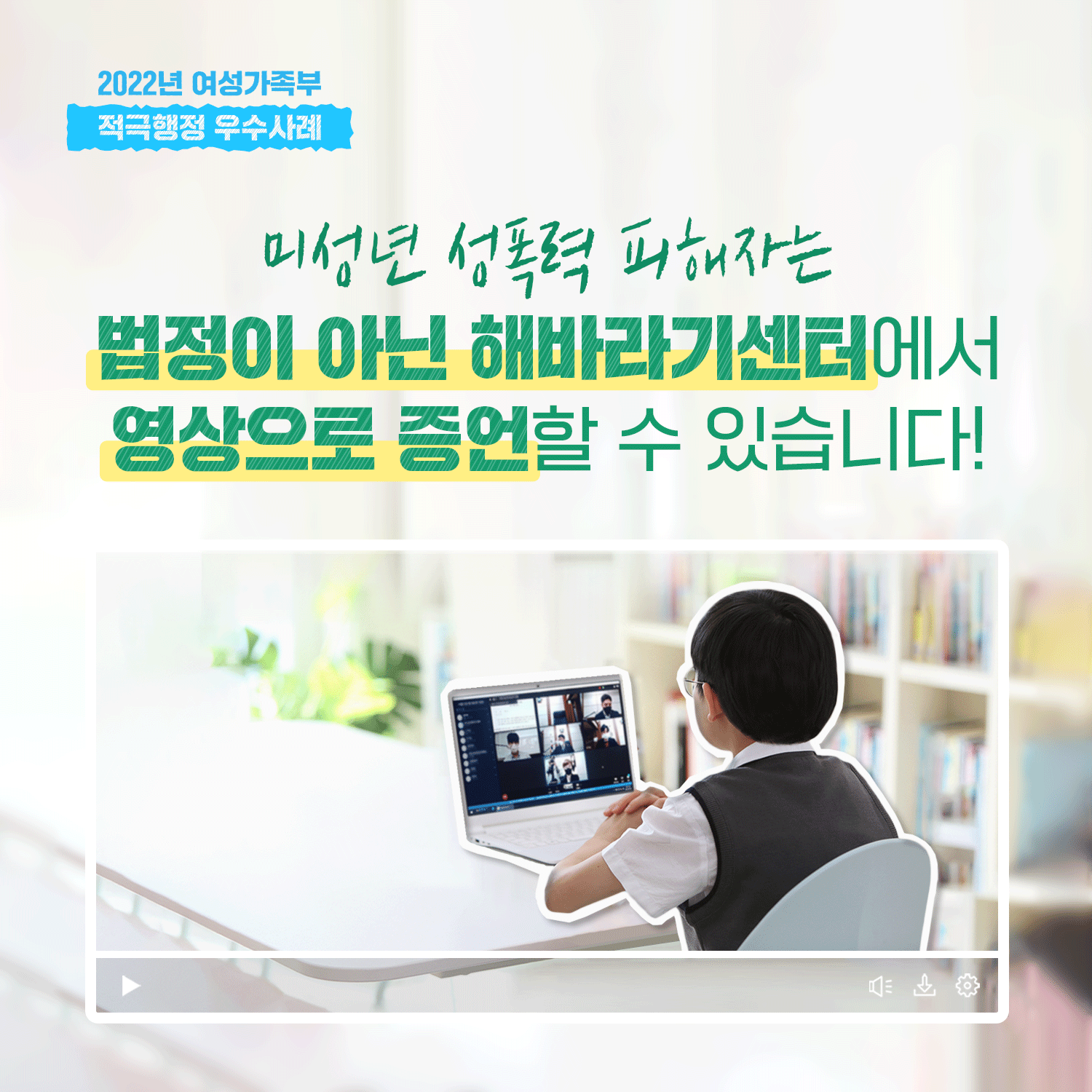 출처 : 카드뉴스 > e 뉴스 > 알림·소식 > 여성가족부 - [2022년 여성가족부 적극행정 우수사례] 해바라기센터 연계 성폭력 피해자 영상증인신문 전국 확대 (mogef.go.kr)