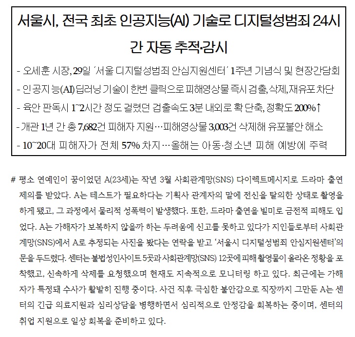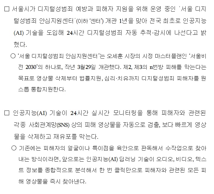 출처: 서울시, 전국 최초 인공지능(AI) 기술로 디지털성범죄 24시간 자동 추적·감시 > 보도자료 | 서울특별시 (seoul.go.kr)