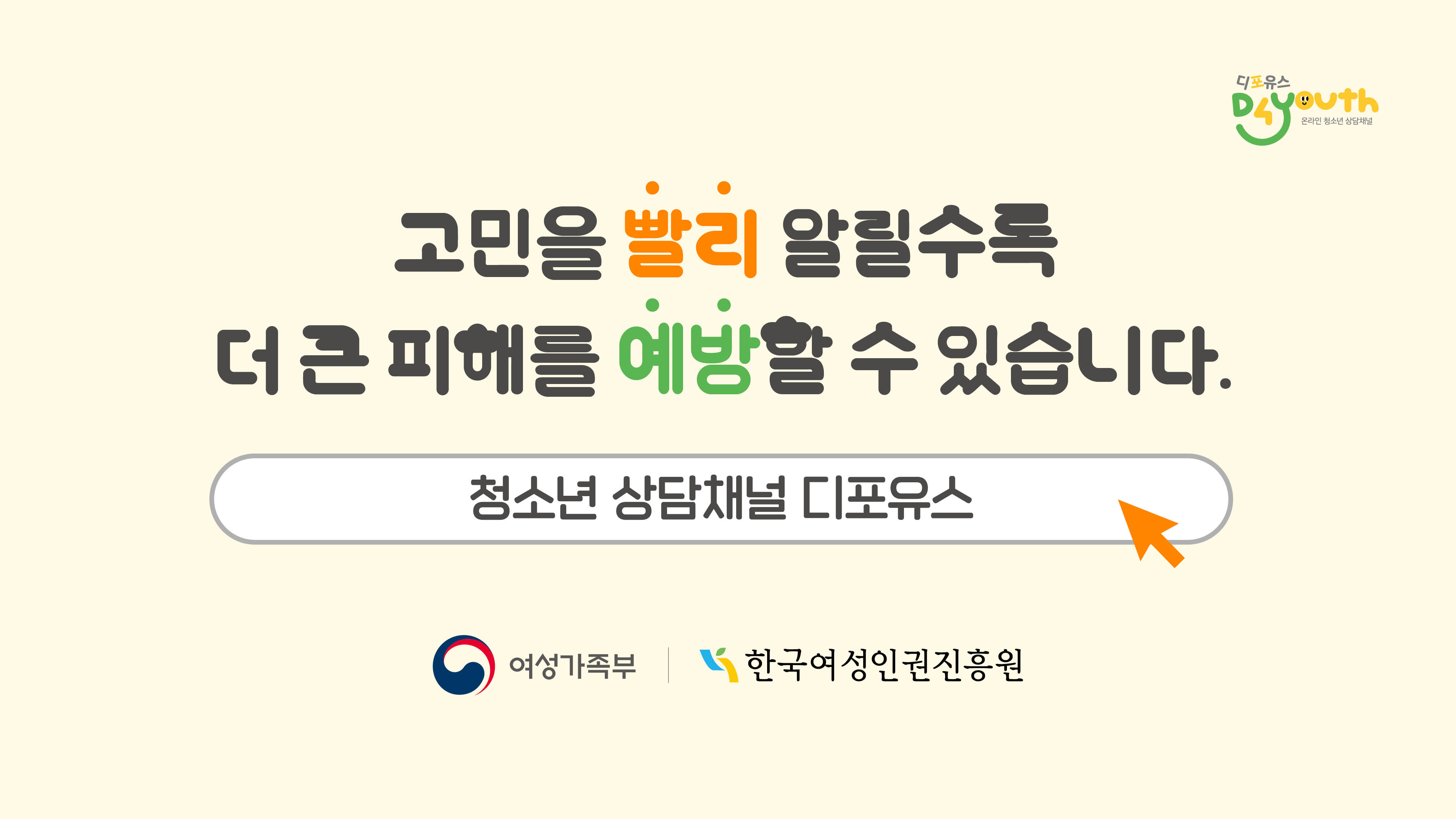 【 청소년 상담채널‘디포유스(d4youth)’란? 】 ◈ 온라인 성착취(성매매) 피해 아동·청소년을 위한 상담채널! ㅇ [대상] 성착취 피해를 입었거나, 관련 상담을 원하는 아동·청소년 및 조력인 등 누구나 ㅇ [내용] 피해상황별 정보 제공 및 연계(심리상담·법률·의료·피해촬영물 삭제 등) ㅇ [상담시간] 평일 오전 10시~오후 10시 ㅇ [상담방법] 각 채널 검색 후 일대일 채팅 및 메시지 전송 ※ 카카오톡·라인 @d4youth / 트위터·인스타그램·페이스북 @d4youth1020 |